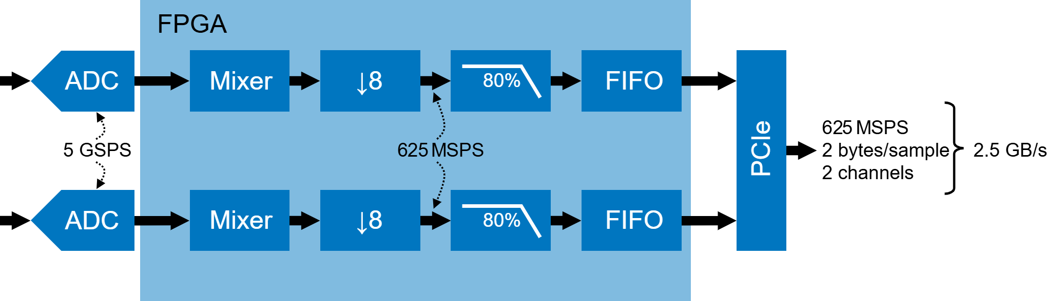 Le velocità dei dati grezzi provenienti dai digitalizzatori a banda larga possono superare i limiti pratici di trasferimento e archiviazione. A 10 miliardi di campioni al secondo e due byte per campione, un singolo canale genera circa 20 GB/s. Per gestire questo volume di dati campionati, viene utilizzata l'elaborazione FPGA integrata per ridurre la velocità dei dati prima del trasferimento tramite collegamenti PCIe.