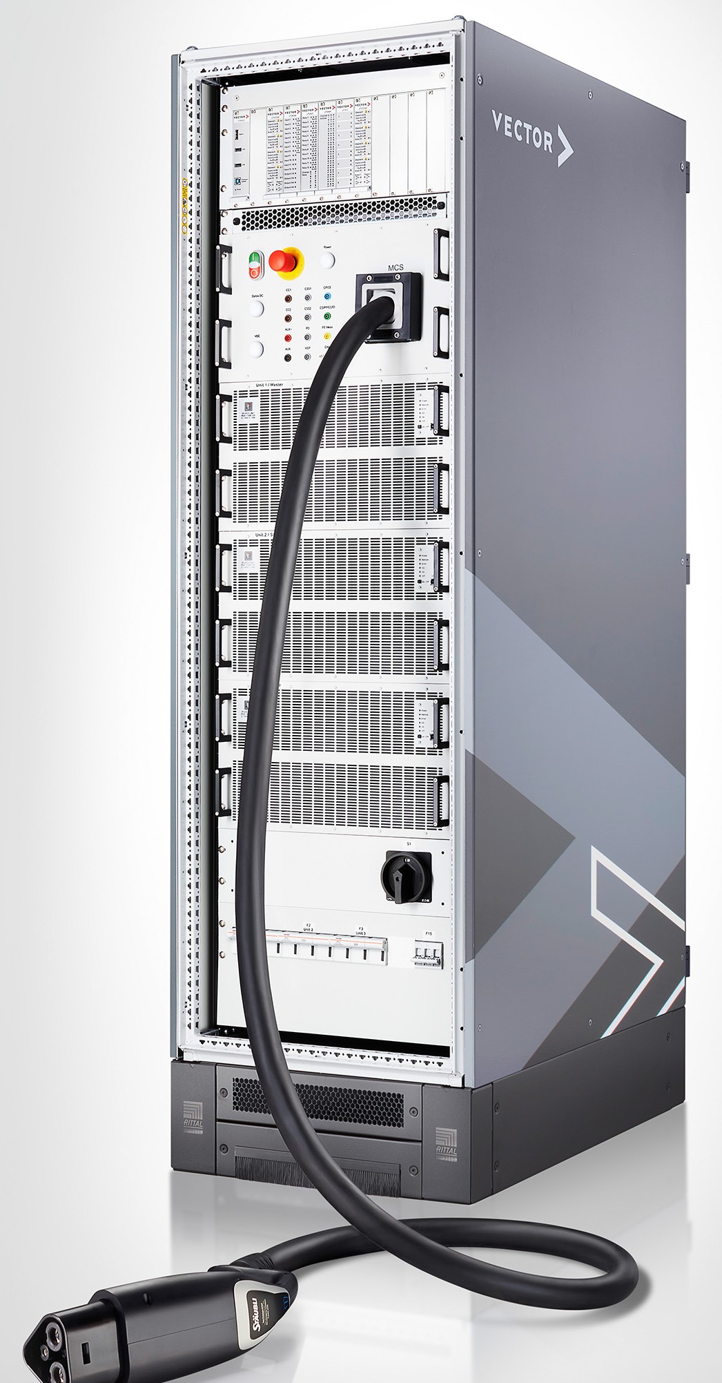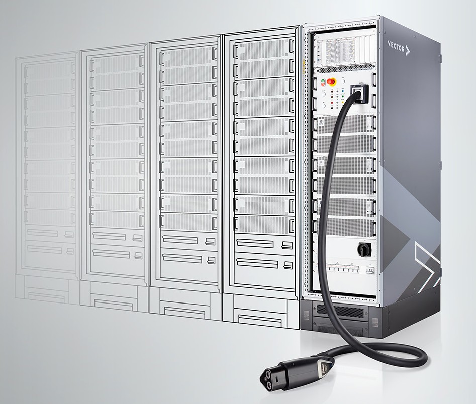Il nuovo sistema di test vCTS.performance amplia il portafoglio prodotti esistente di Vector, che comprende già un'ampia gamma di soluzioni per la mobilità elettrica. Tra queste vi è il vCTS, un sistema di test configurabile con una potenza di uscita di 30 kW DC, sviluppato appositamente per testare la comunicazione nelle colonnine di ricarica.