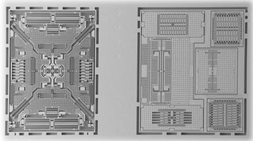 Il chip LSM6DSV320X con le strutture microelettromeccaniche (MEMS) del giroscopio (a sinistra) e dei due accelerometri a basso e alto g (a destra)