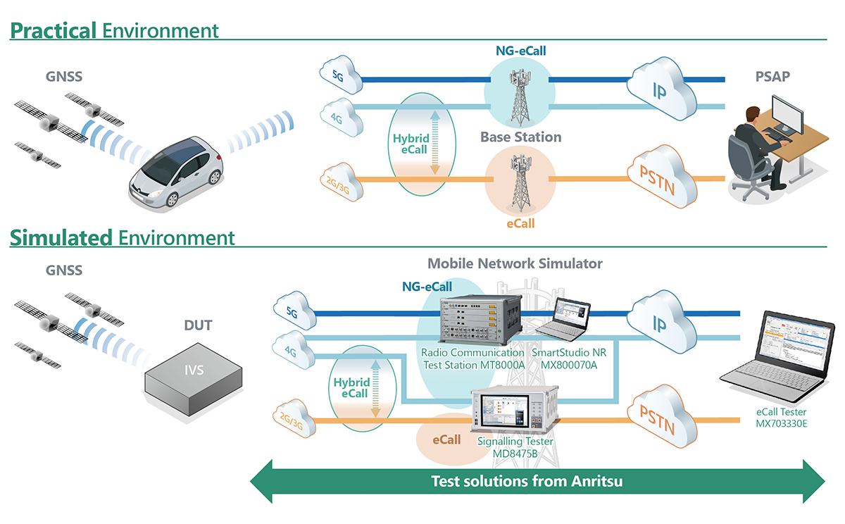 La soluzione di valutazione proposta da Anritsu è costituita da un simulatore PSAP necessario per lo sviluppo di sistemi di bordo (IVS) compatibili con Hybrid eCall.