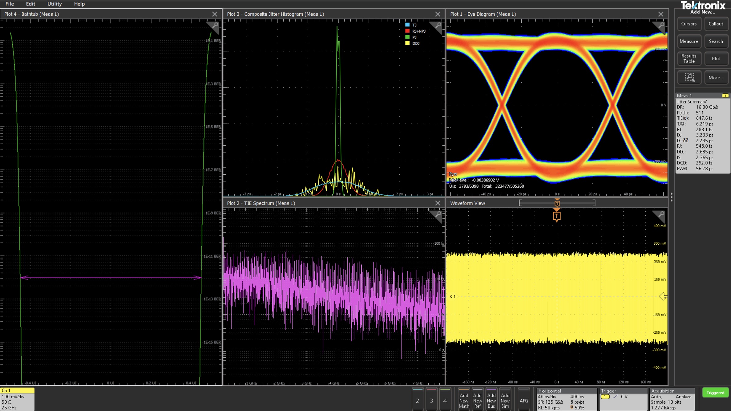 L'oscilloscopio DPO Serie 7 è una risposta strategicamente differenziata rispetto a tutte queste esigenze; non solo è dotato di un ADC a 10 bit, ma lo abbina a un front-end a bassissimo rumore. Questo oscilloscopio offre il più elevato ENOB a varie impostazioni di frequenza grazie a un'architettura che riduce al minimo il rumore indotto dall'oscilloscopio, per una cattura pulita di jitter, diagrammi a occhio e bathtub, integrità dell'alimentazione e conformità agli standard seriali.