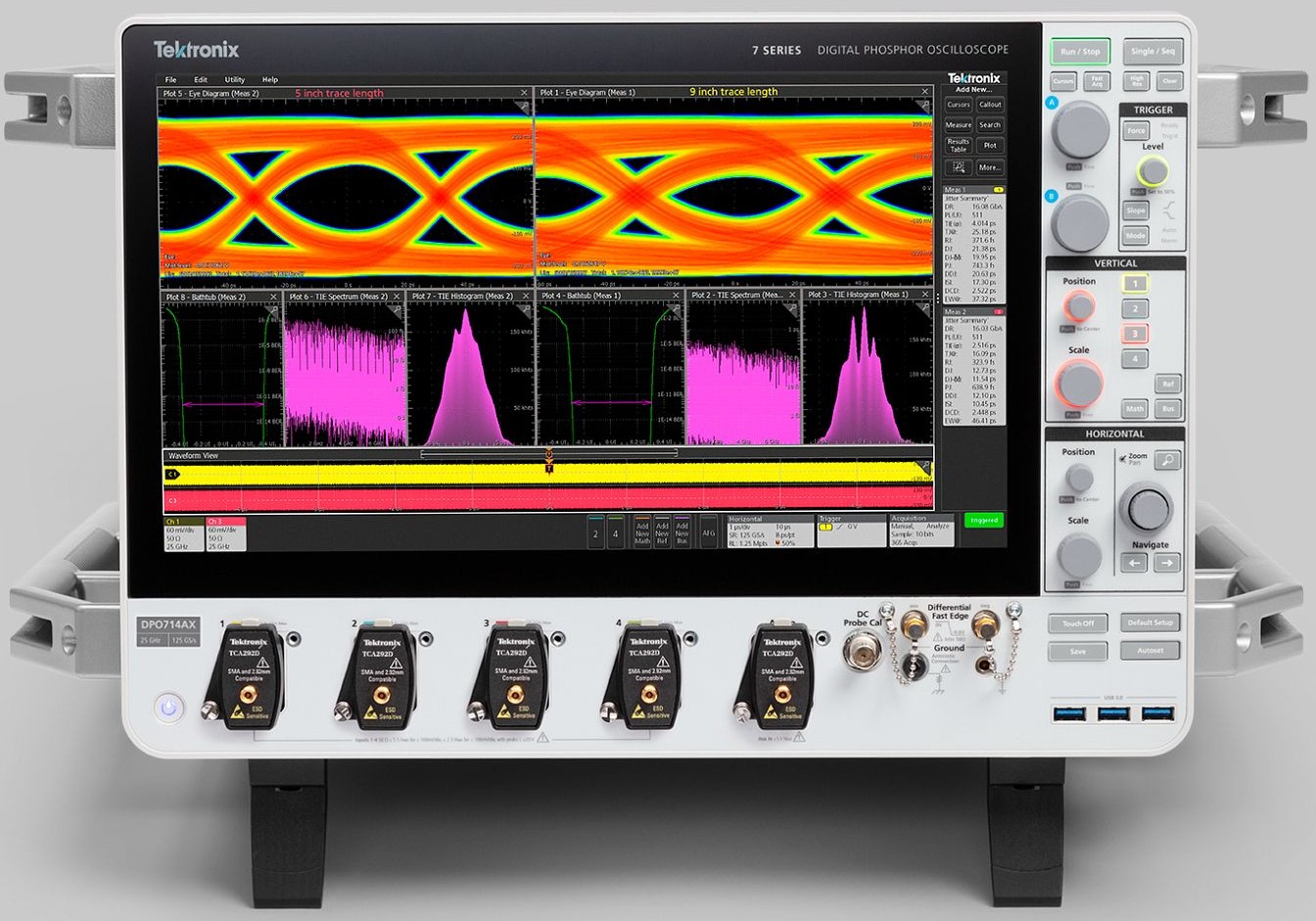 Il nuovo oscilloscopio DPO della Serie 7 visualizza i diagrammi a occhio ed esegue l'analisi del jitter su due o più segnali contemporaneamente