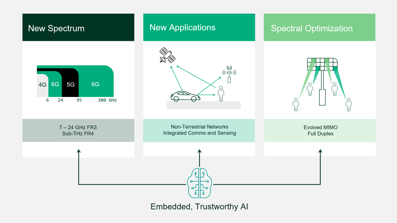 Alla base del 6G si trova l'espansione dello spettro di frequenze. È necessario un nuovo spettro di frequenze per aumentare la capacità e le bande più promettenti per il 6G sono quelle comprese tra 7 e 24 GHz (o "FR3" o la banda medio-alta).